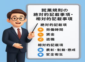 就業規則には、労働基準法で定められた「絶対的必要記載事項」と